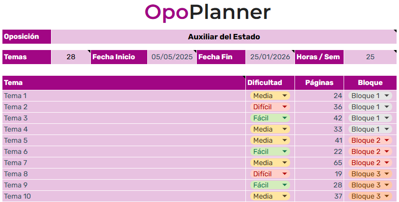 Otras de las patas que aseguran una buena preparación es la planificación. Es muy importante saber que te va a dar tiempo a preparar tu temario y evitar sorpresas cuando se acerca el examen. En este bloque vemos: